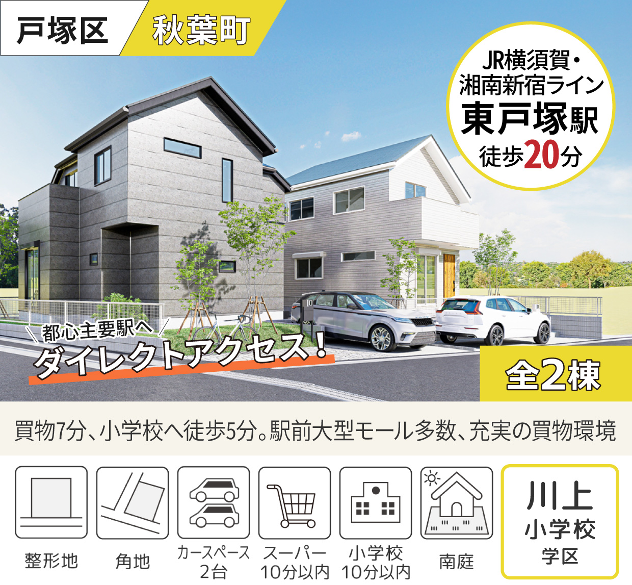 最寄りの「東戸塚」駅西口・東口には大型ショッピングモールが立ち並び、ショッピングやグルメを日常的に楽しめます。駅周辺にはクリニックや子育て支援施設も揃い、安心して子育てができる環境。都心主要駅へダイレクトアクセスです。