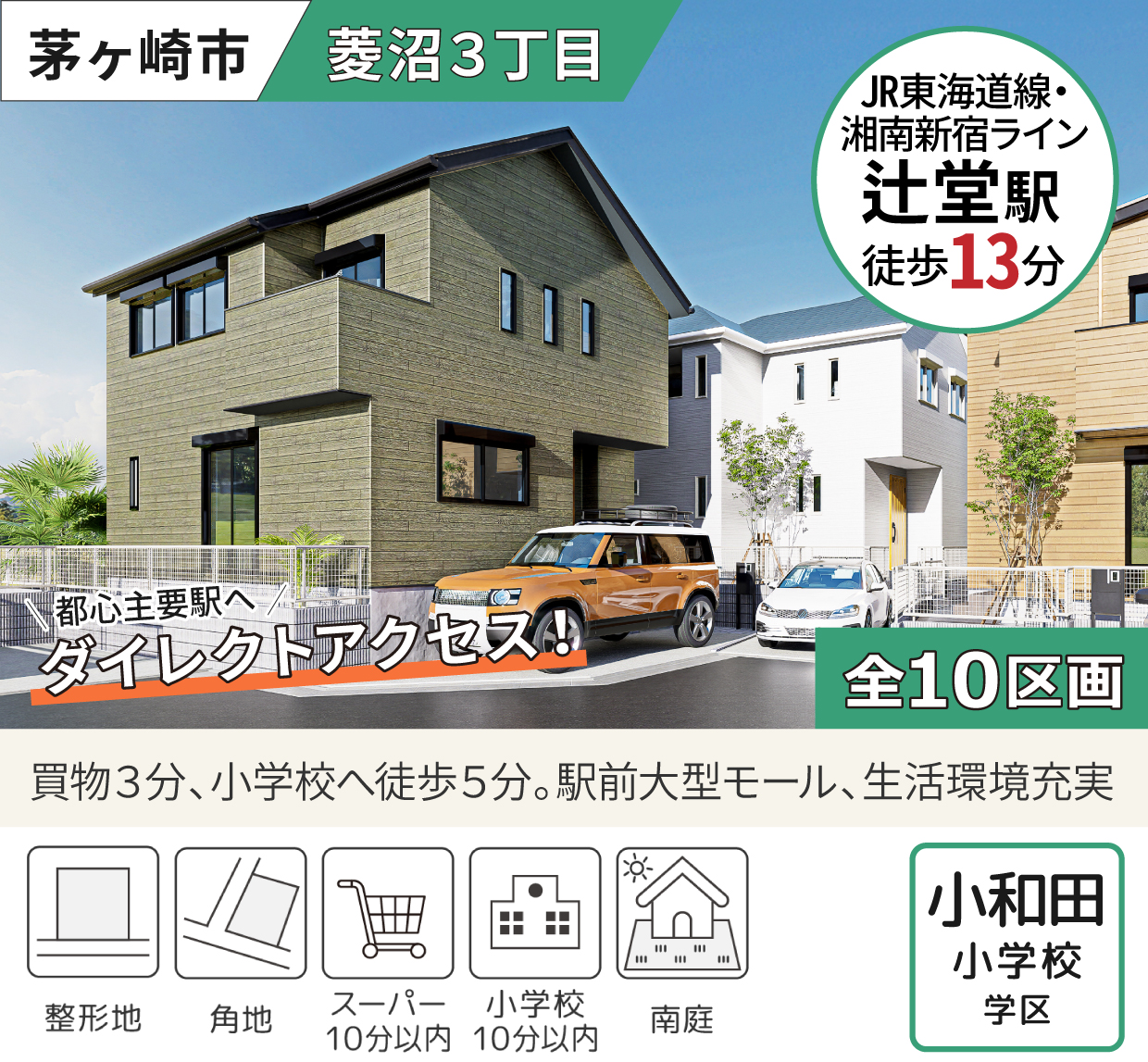 「辻堂駅」へ徒歩13分。周辺は平坦地でどこへ行くにもラクラク♪都心へはダイレクトアクセスで快適。駅前の充実した商業エリアや憧れの湘南を感じることができる魅力的な立地です。