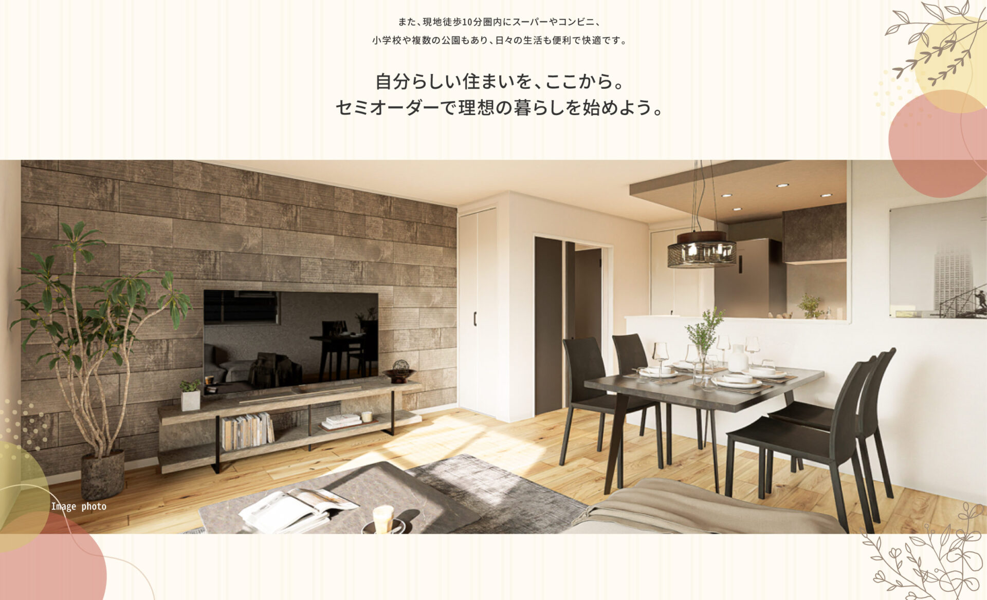 基本の間取りプランをベースに外観・内装・キッチンなどの水回り・外構などお好みのスタイルをセレクトできます。