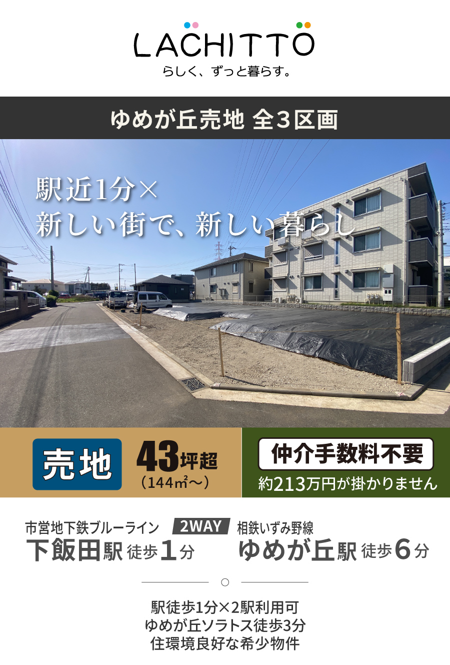 | 交 通 | 相鉄いずみ野線「ゆめが丘駅」徒歩6分 約450m / 横浜市営地下鉄ブルーライン「下飯田駅」徒歩1分 約80m / 小田急江ノ島線・相鉄いずみ野線・横浜市営地下鉄ブルーライン「湘南台駅」徒歩23分又は自転車9分 / ■「ゆめが丘駅」より 「横浜駅」まで直通32分 「品川駅」まで乗車50分 「東京駅」まで乗車58分 「渋谷駅」まで乗車55分 「新宿駅」まで乗車66分 ■「下飯田駅」より ※「横浜駅」まで乗車18分 ※「品川駅」まで乗車40分 ※「渋谷駅」まで乗車48分 ※「東京駅」まで乗車49分 ※「新宿駅」まで乗車56分 [平日朝7時台] |
