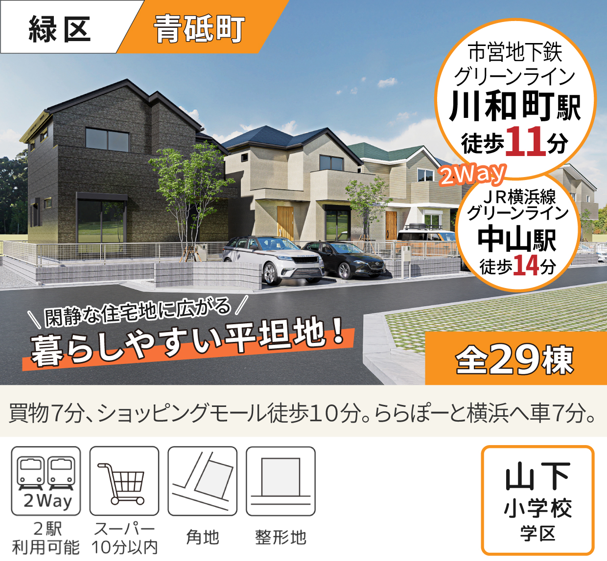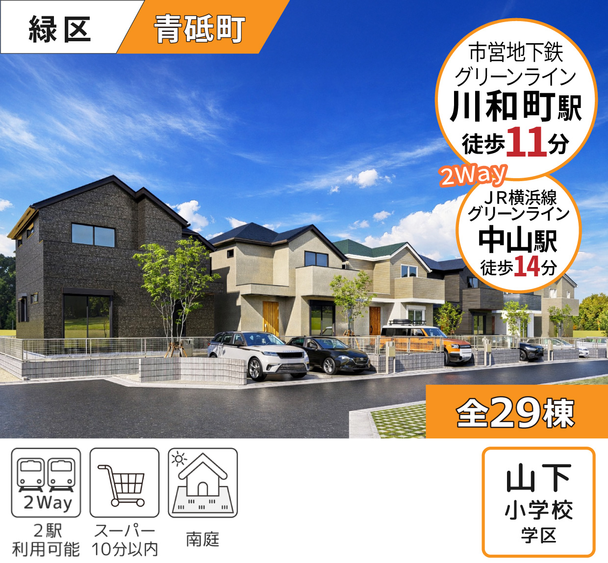 「川和町駅」徒歩11分・「中山駅」徒歩14分の2駅利用で便利。暮らしやすい平坦地に広がる全29棟の新規分譲地は、いずれも37坪超のゆとりある敷地。緑豊かな穏やかな街並みに加え、スーパー徒歩7分、ショッピングモールやららぽーと横浜へも身近。自然と都市の利便が調和した、快適な住環境です。