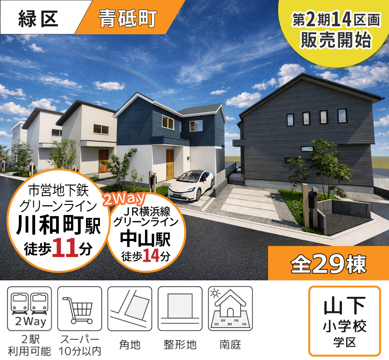 「川和町駅」徒歩11分・「中山駅」徒歩14分の2駅利用で便利。暮らしやすい平坦地に広がる全29区画の新規分譲地は、いずれも37坪超のゆとりある敷地。緑豊かな穏やかな街並みに加え、スーパー徒歩7分、ショッピングモールやららぽーと横浜へも身近。自然と都市の利便が調和した、快適な住環境です。