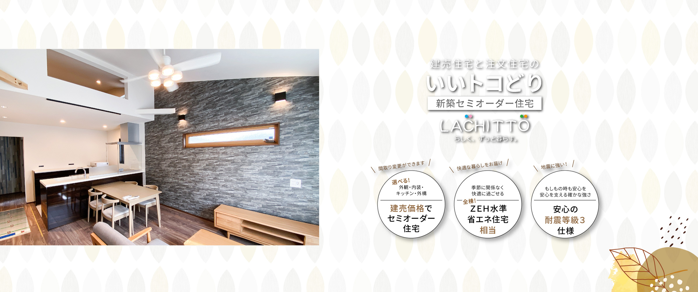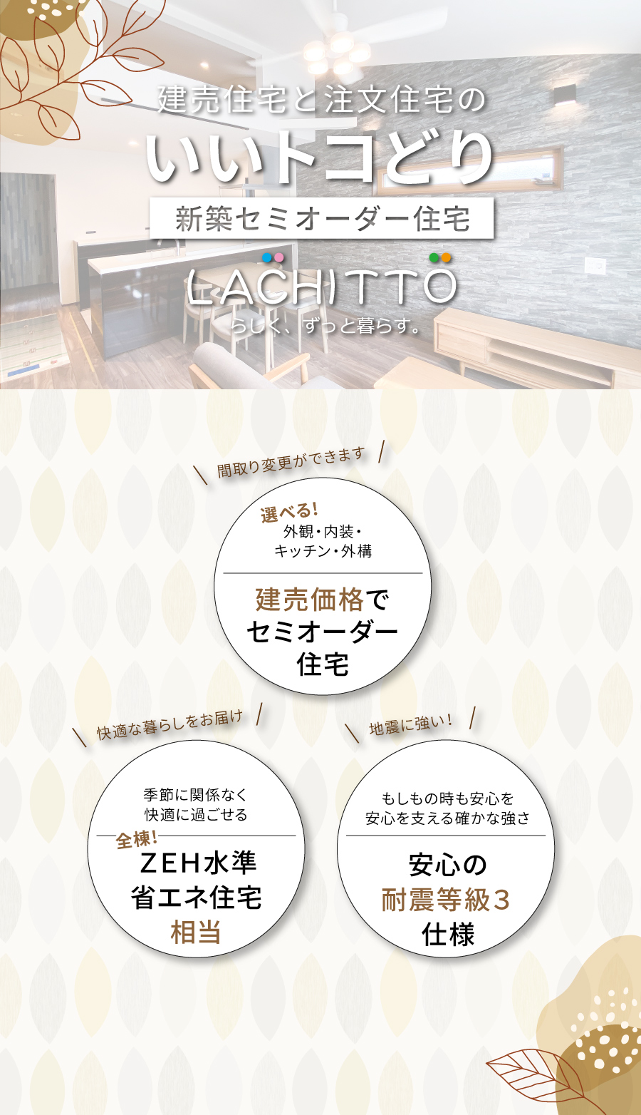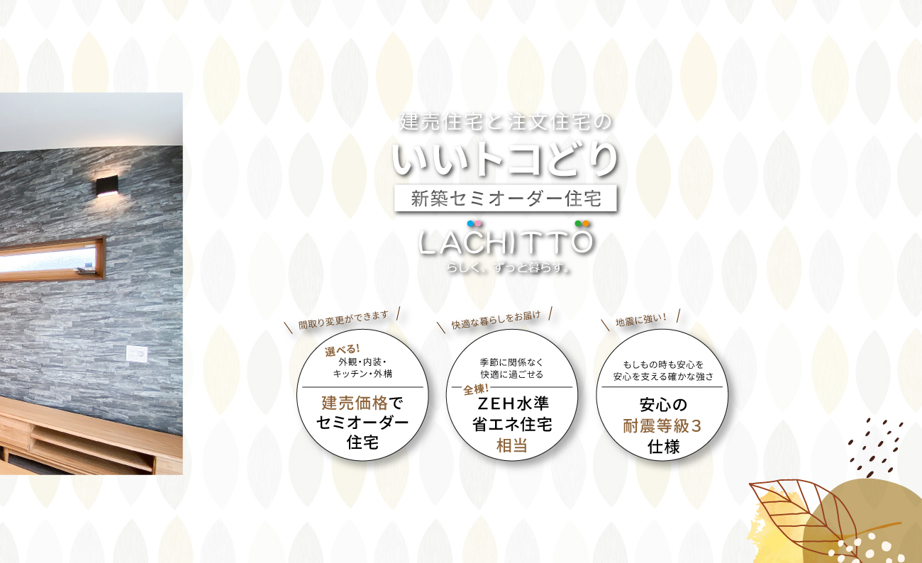 基本の間取りプランをベースに外観・内装・キッチンなどの水回り・外構などお好みのスタイルをセレクトできます。