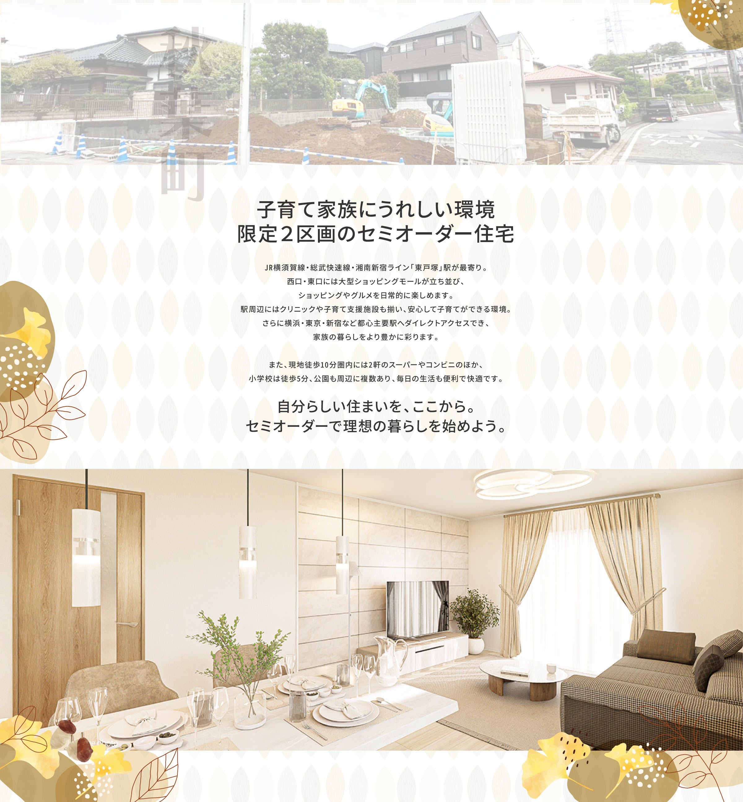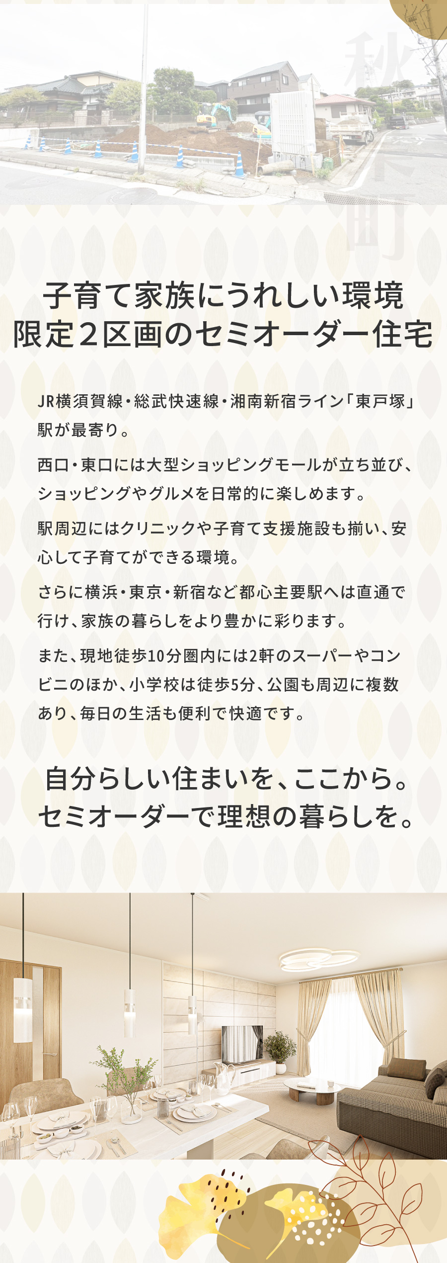 静かな住宅街の落ち着きと東戸塚駅前の賑わいがバランスよく共存するエリア。駅徒歩圏で生活便利、豊かな自然に囲まれる安心して暮らせる街です。