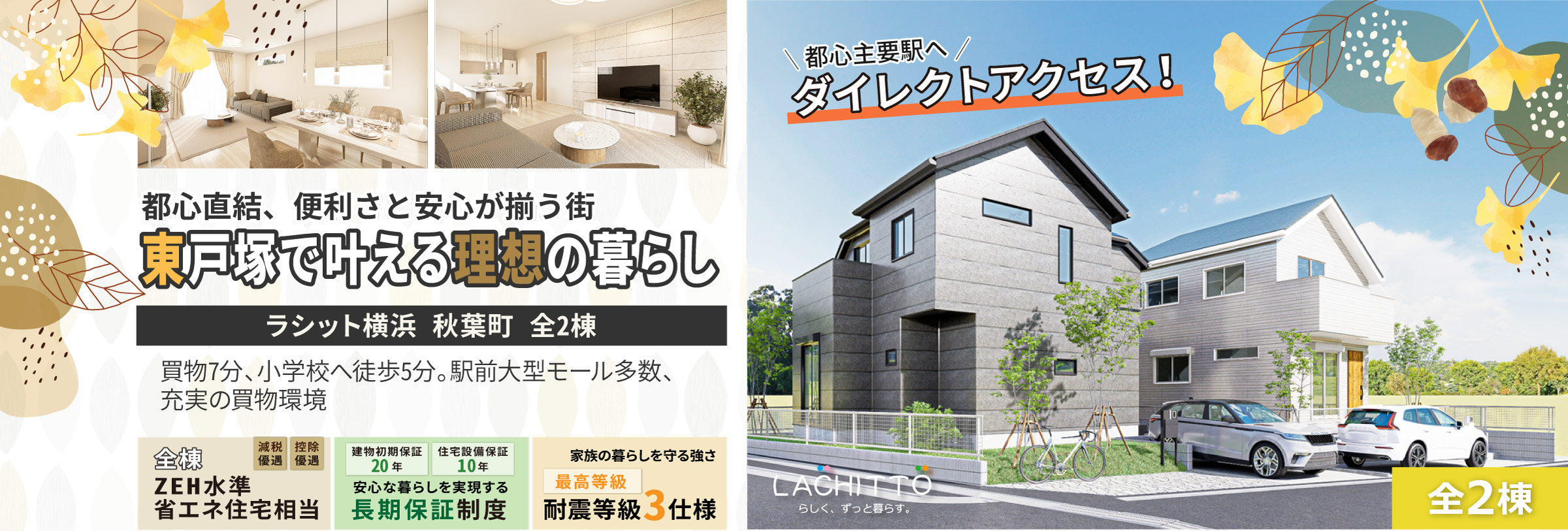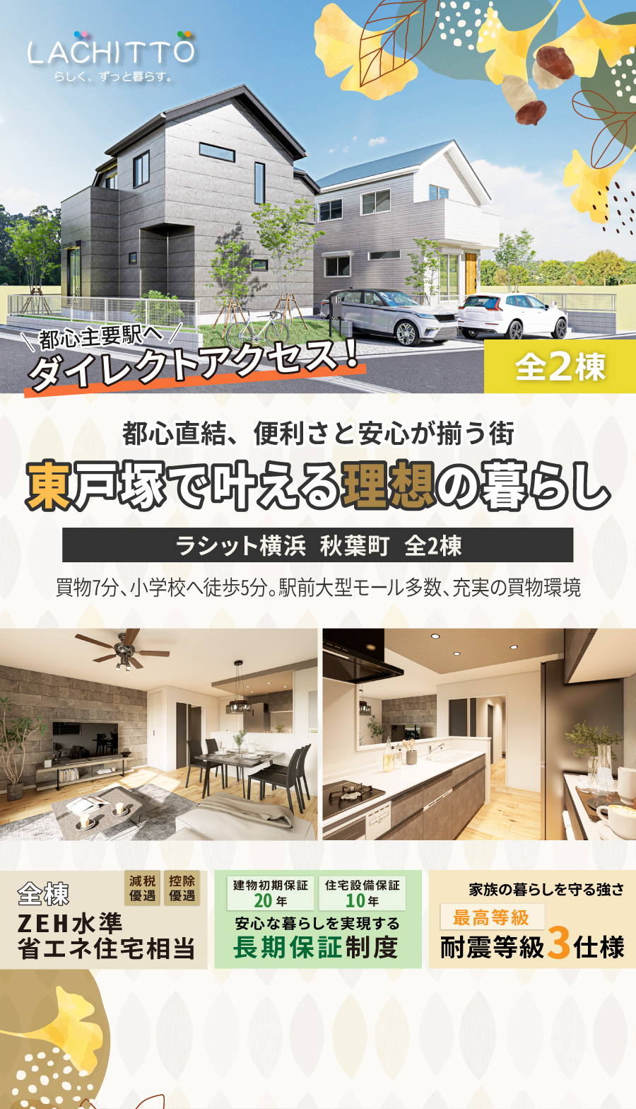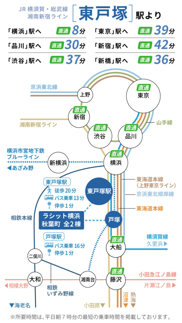 交 通 | JR横須賀・総武快速線・湘南新宿ライン「東戸塚駅」…徒歩20分、バス13分「秋葉」停歩1分/ JR東海道線・横須賀・総武快速線・湘南新宿ライン・上野東京ライン・横浜市営地下鉄ブルーライン「戸塚駅」…バス16分「秋葉」停歩1分/ 相鉄いずみ野線「緑園都市駅」…バス15分「秋葉」停歩1分/ ※「東戸塚駅」から「横浜駅」まで直通8分/ ※「東戸塚駅」から「品川駅」まで直通30分/ ※「東戸塚駅」から「東京駅」まで直通39分/ ※「東戸塚駅」から「渋谷駅」まで直通37分/ ※「東戸塚駅」から「新宿駅」まで直通42分/[平日朝7時台] |