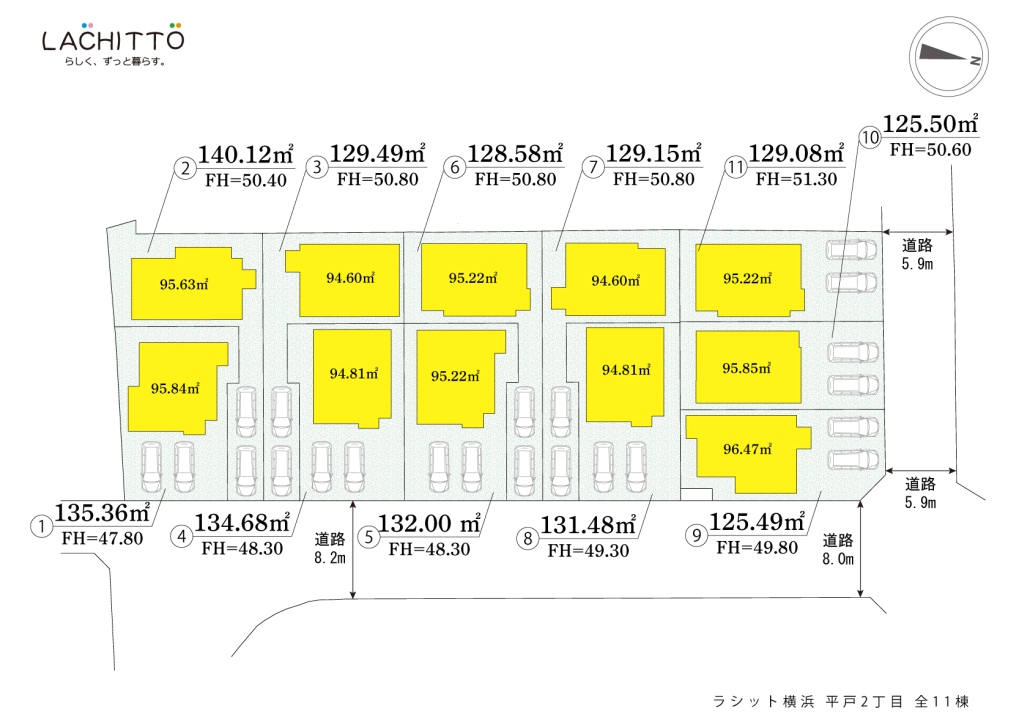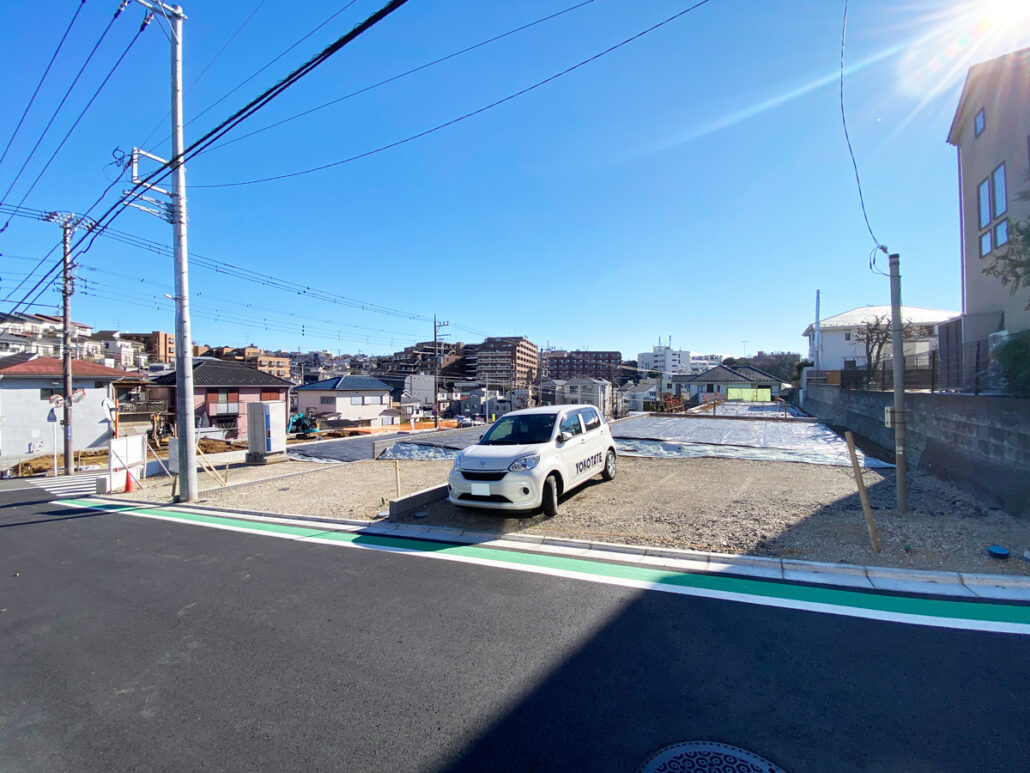 東戸塚エリア・平戸2丁目の穏やかな住宅街に誕生した全11棟の分譲地。全区画125㎡(37坪)超のゆとりある敷地に、カースペース2台分を確保しています。