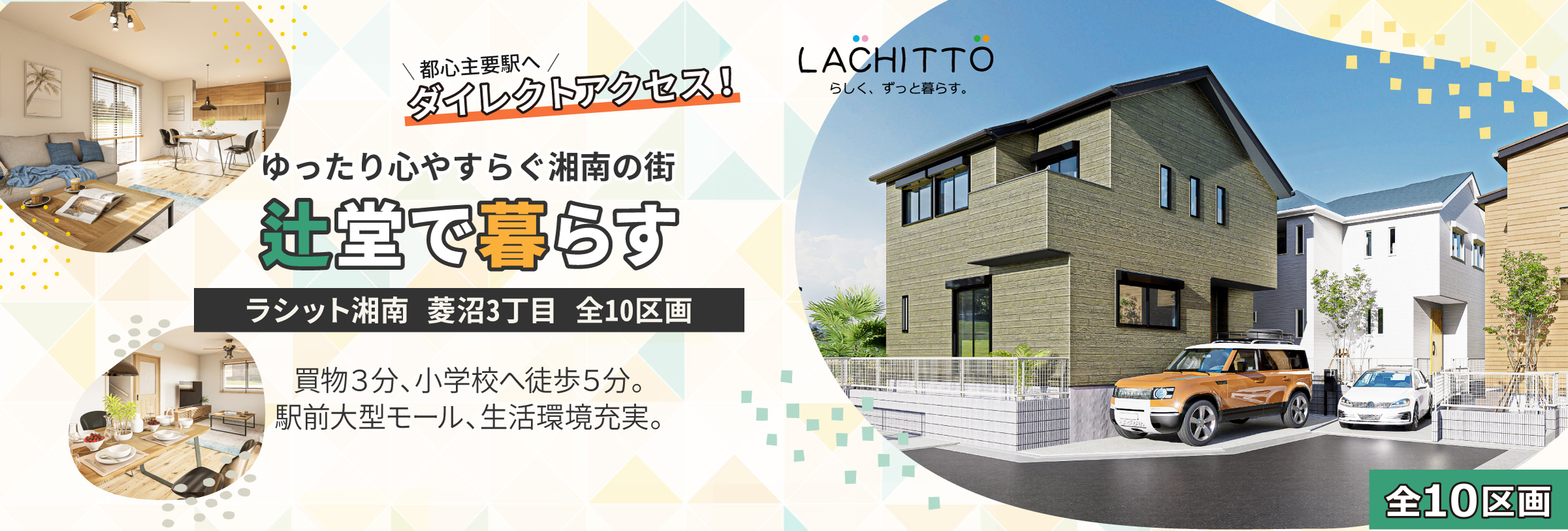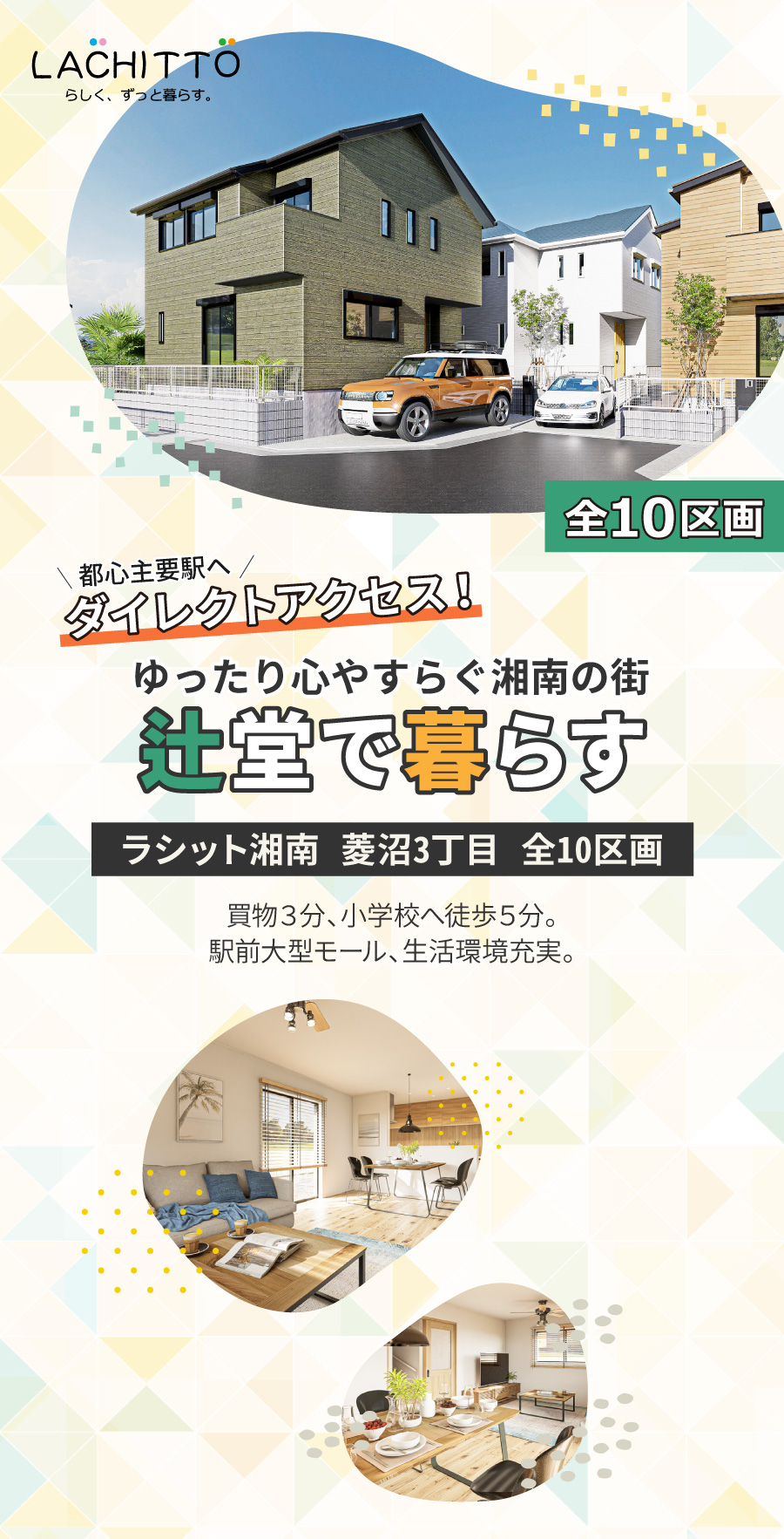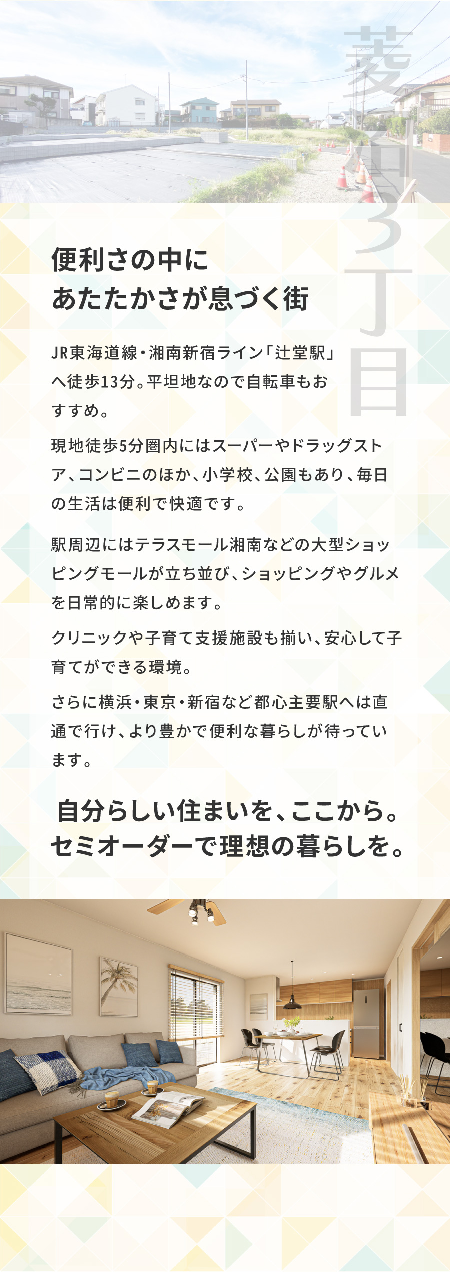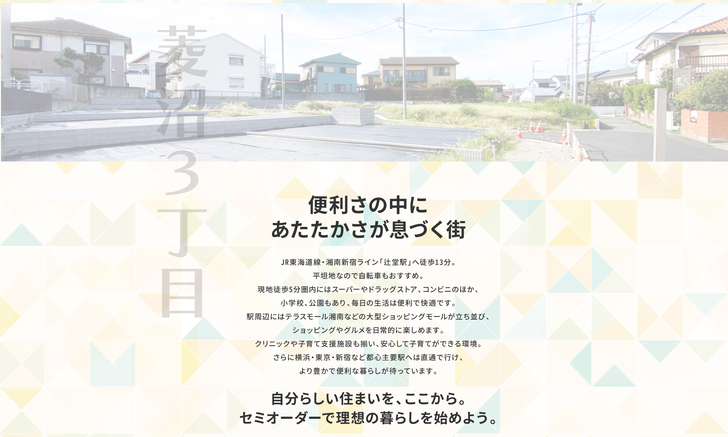 静かな住宅街の落ち着きと辻堂駅前の賑わいがバランスよく共存するエリア。地域のつながりが感じられる安心して暮らせる街です。