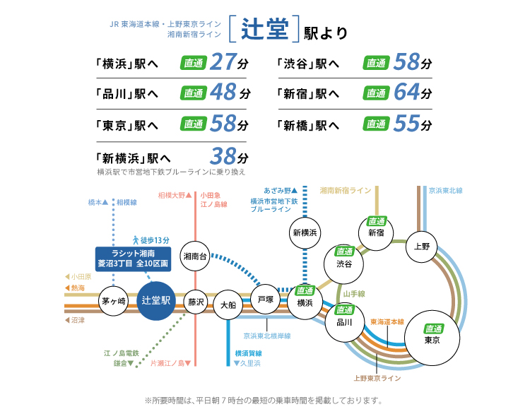 「辻堂駅」は都心主要駅へ直通で50~60分とスムーズにアクセスできます。