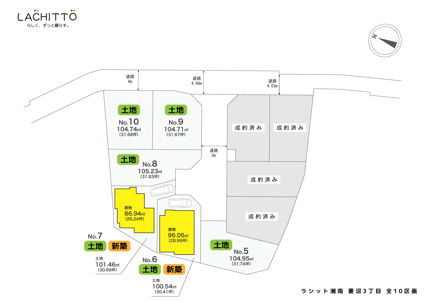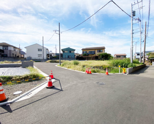 閑静な住宅街に位置し、車通りも少なく静かで落ち着いた環境。新設道路の先は通り抜けできないため、住む方々のプライベートがしっかり守られます。