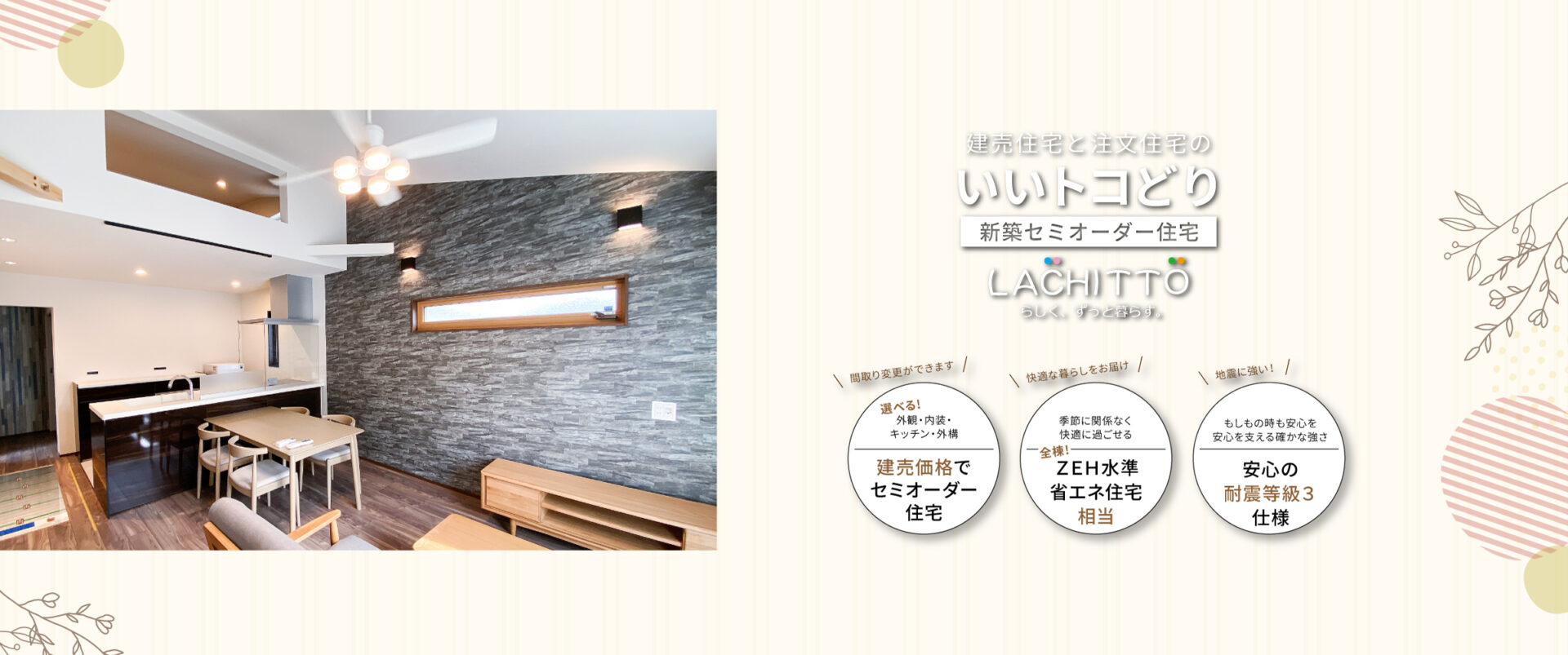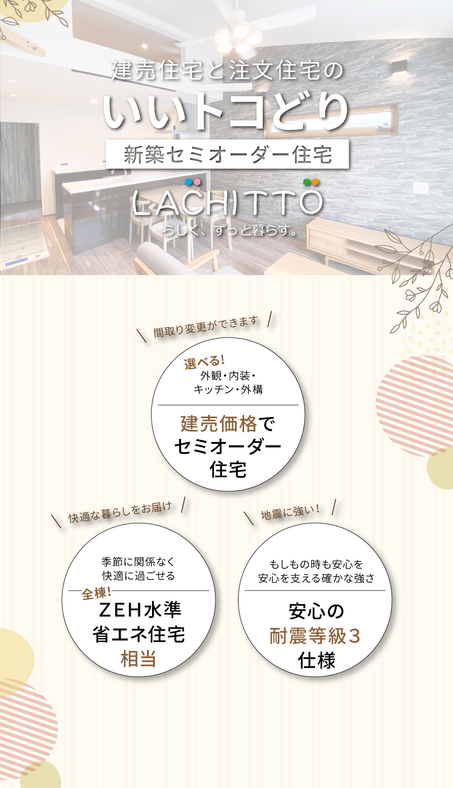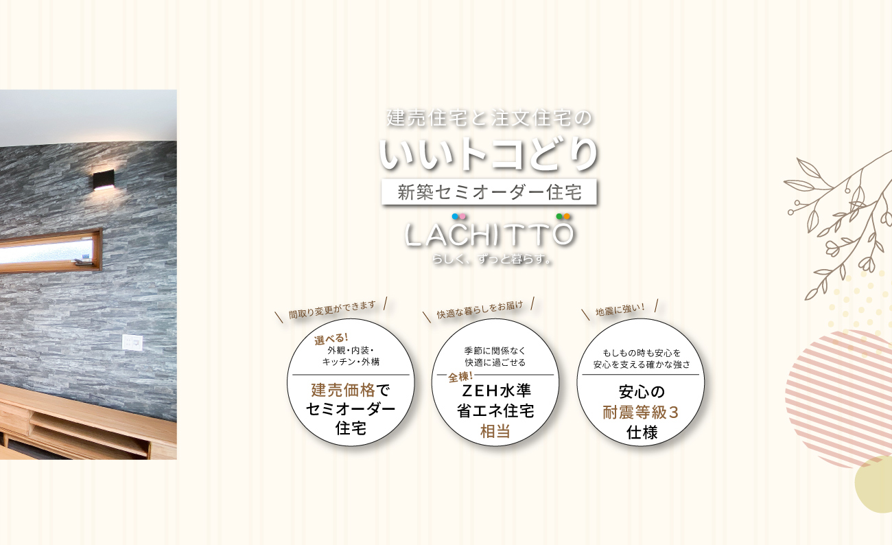 基本の間取りプランをベースに外観・内装・キッチンなどの水回り・外構などお好みのスタイルをセレクトできます。
