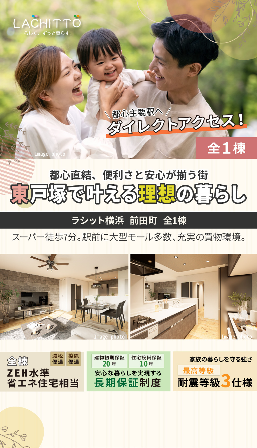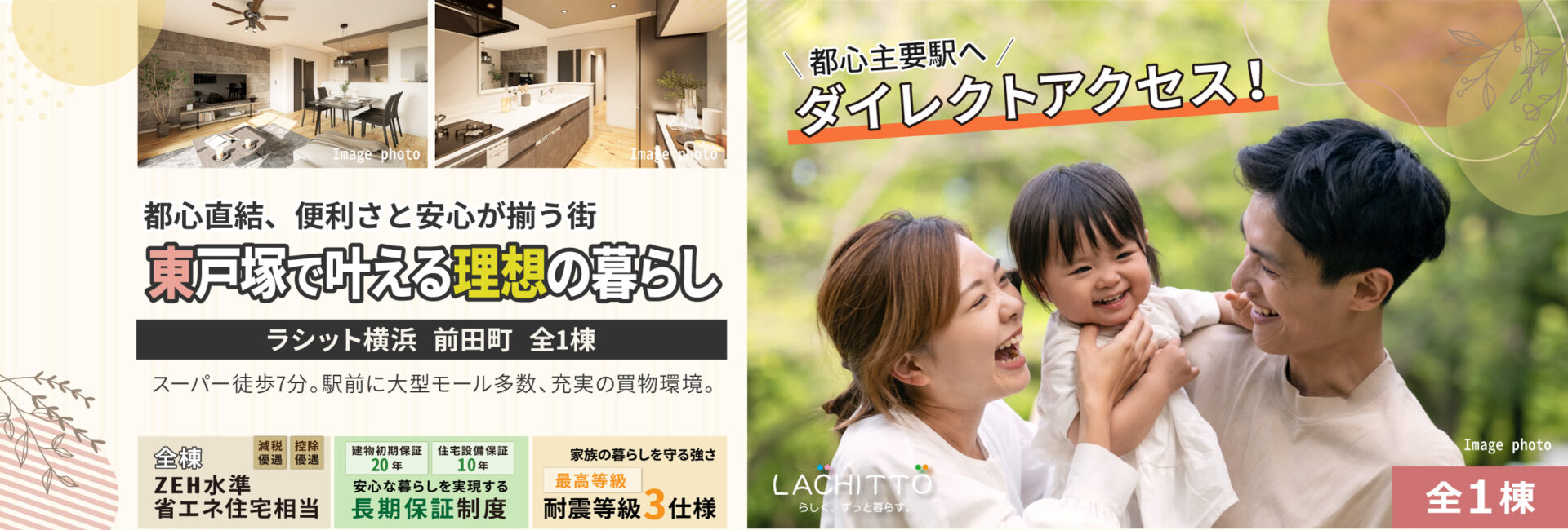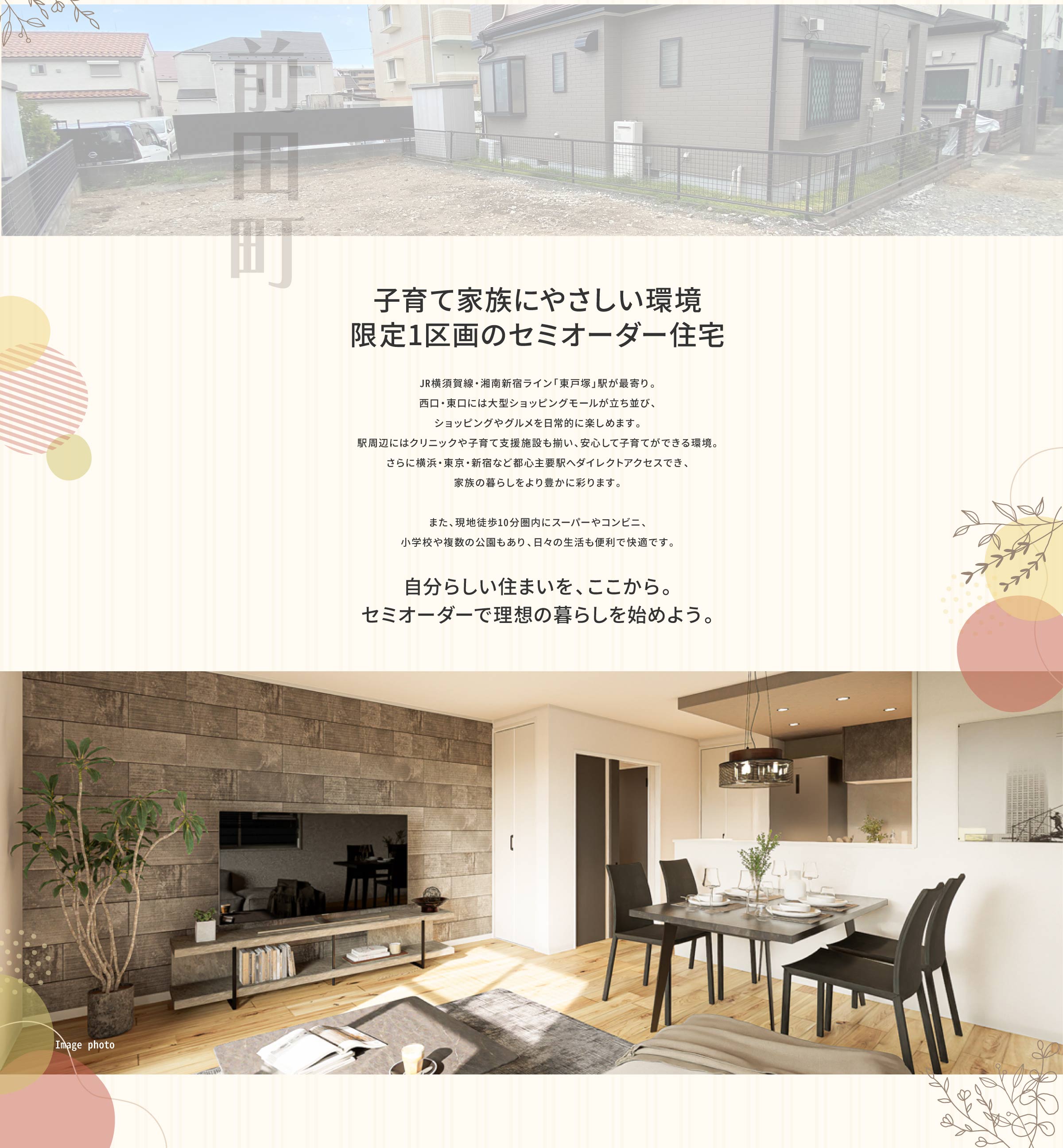 静かな住宅街の落ち着きと東戸塚駅前の賑わいがバランスよく共存するエリア。駅徒歩圏で生活便利、豊かな自然に囲まれる安心して暮らせる街です。