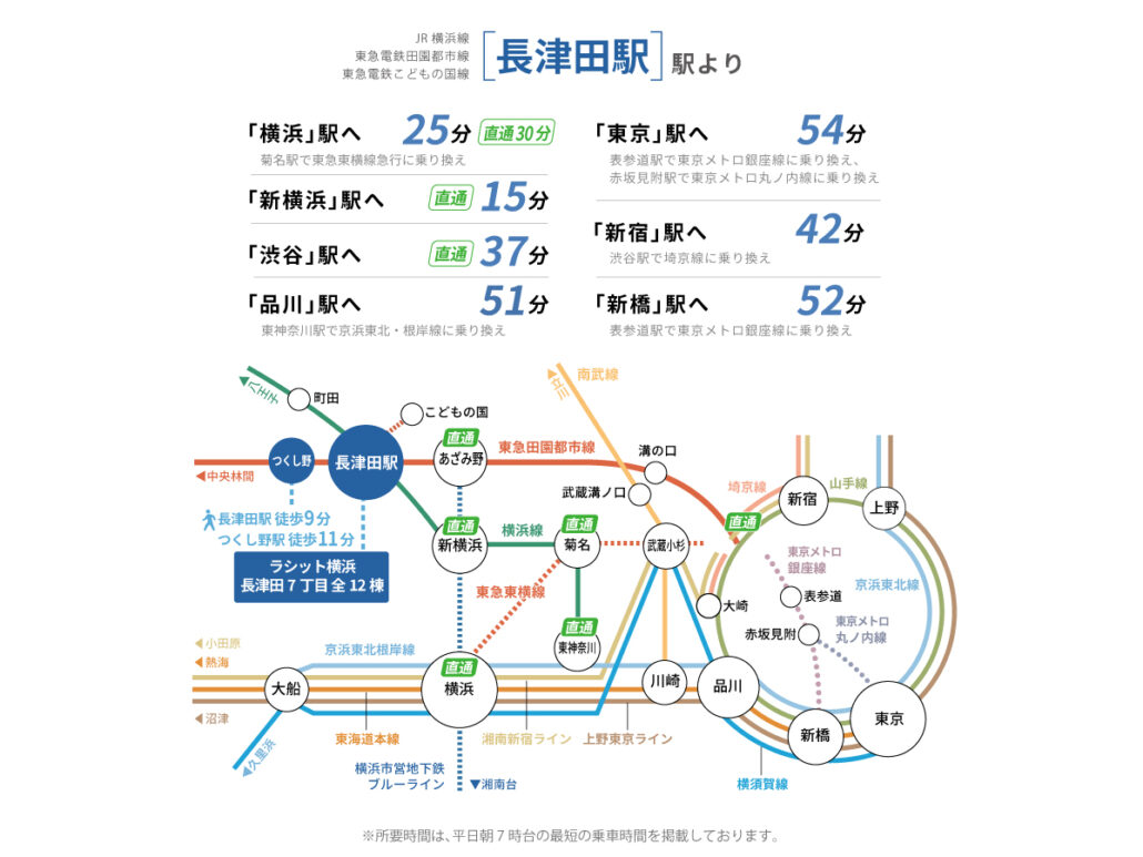 | 交 通 | JR横浜線、東急田園都市線、東急こどもの国線「長津田駅」徒歩9分 約720m/ 東急田園都市線「つくし野駅」徒歩11分 約831m/ ※「長津田駅」から「横浜駅」まで直通30分・乗車25分/ ※「長津田駅」から「品川駅」まで乗車51分/ ※「長津田駅」から「東京駅」まで乗車54分/ ※「長津田駅」から「渋谷駅」まで直通37分/ ※「長津田駅」から「新宿駅」まで乗車42分/ [平日朝7時台] |