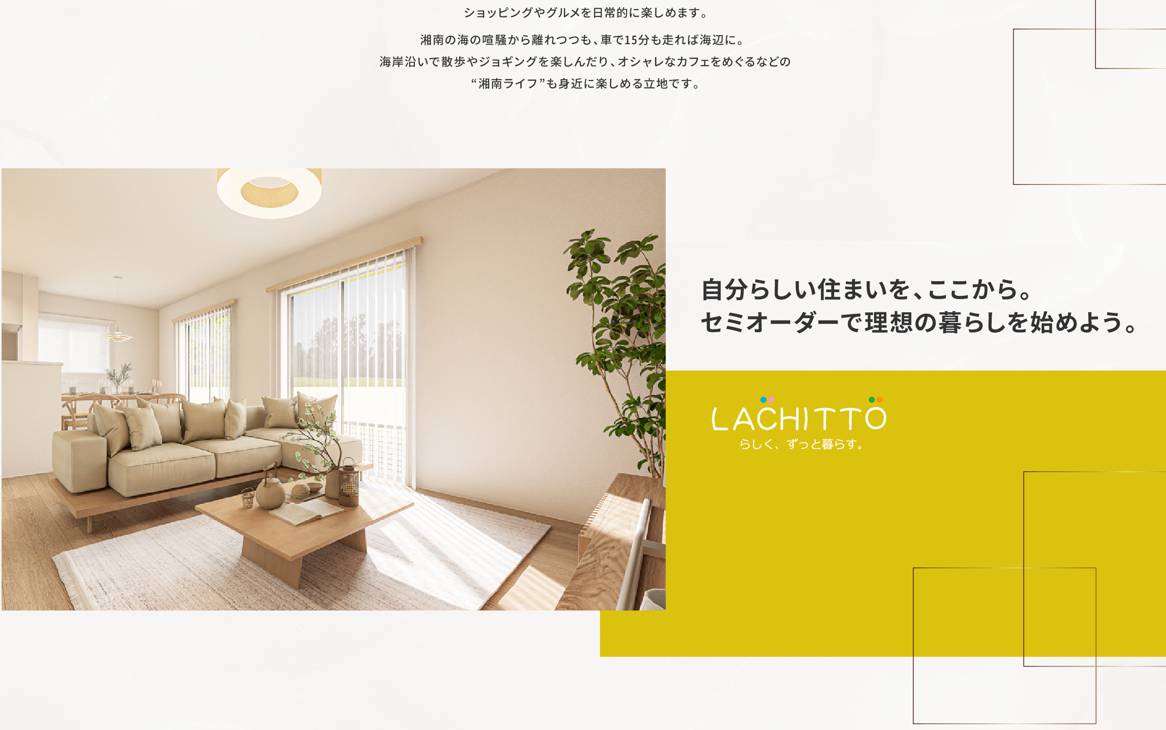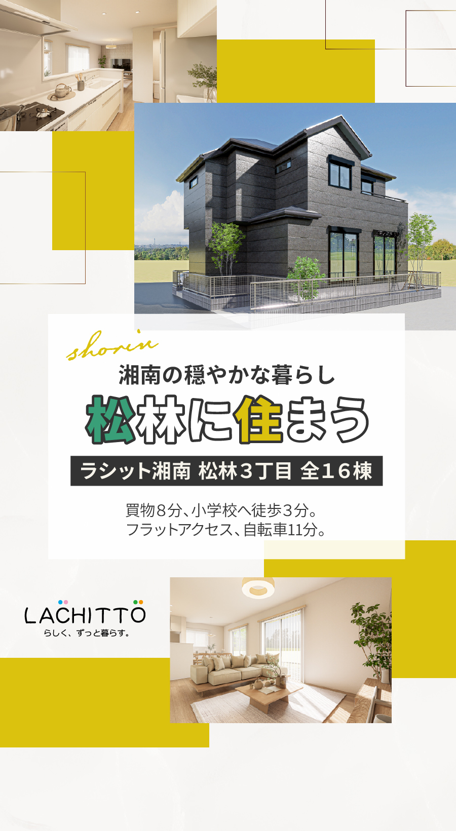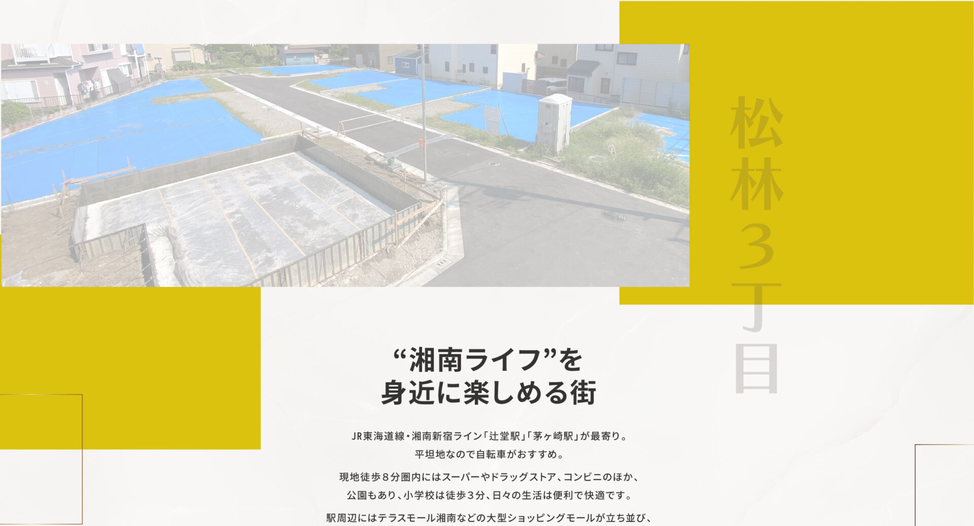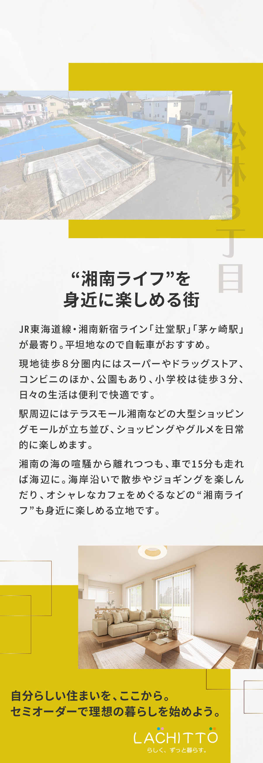 | 交 通 | JR東海道線、湘南新宿ライン「辻堂駅」バス11分「松林」停歩6分又は徒歩29分(自転車11分)/ JR東海道線・相模線・湘南新宿ライン「茅ヶ崎駅」徒歩34分(自転車14分)又はバス11分「室田小学校入口」停歩7分/ JR相模線「北茅ヶ崎駅」…徒歩29分(自転車11分)/ JR東海道本線「辻堂駅」より「品川駅」まで直通48分/[平日朝7時台] |