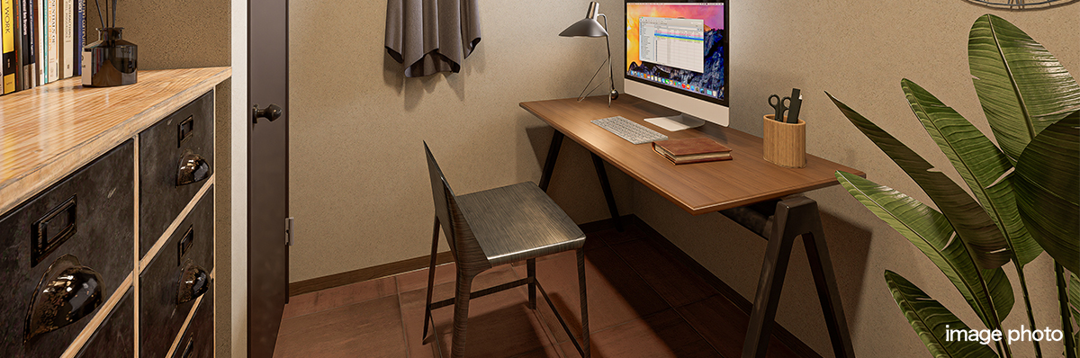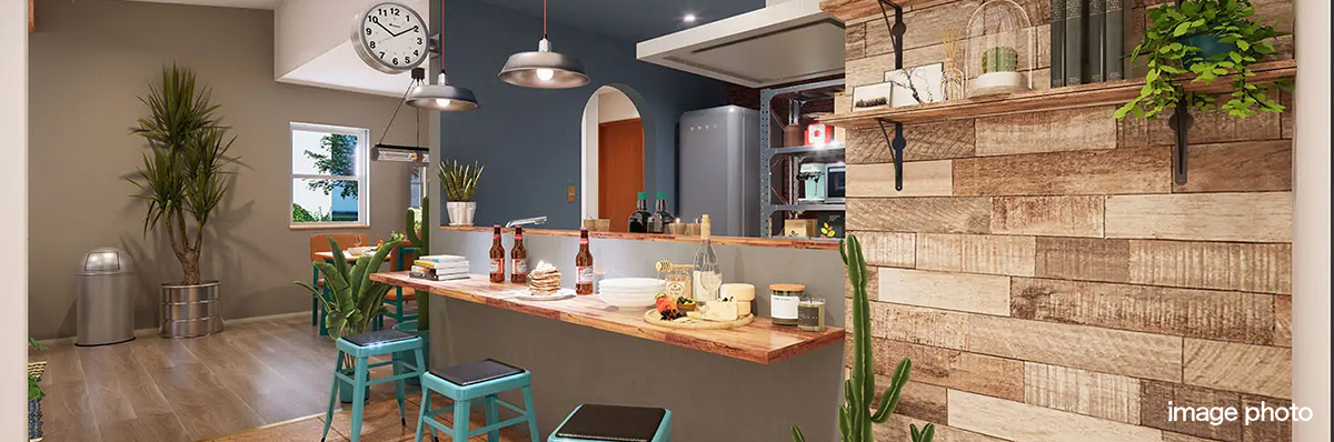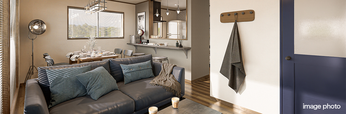 リビング・ダイニングには、ダルトンのネイビーソファやウッドテーブルを採用。キッチンやフリースペース、トイレにもダルトンの家具や照明を取り入れ、アクセントクロスや建具にも細やかなこだわりを随所に施しました。落ち着きのなかに洗練されたデザインが光る、上質で特別な空間に仕上がっています。※一部仕様は実際のものと異なります。