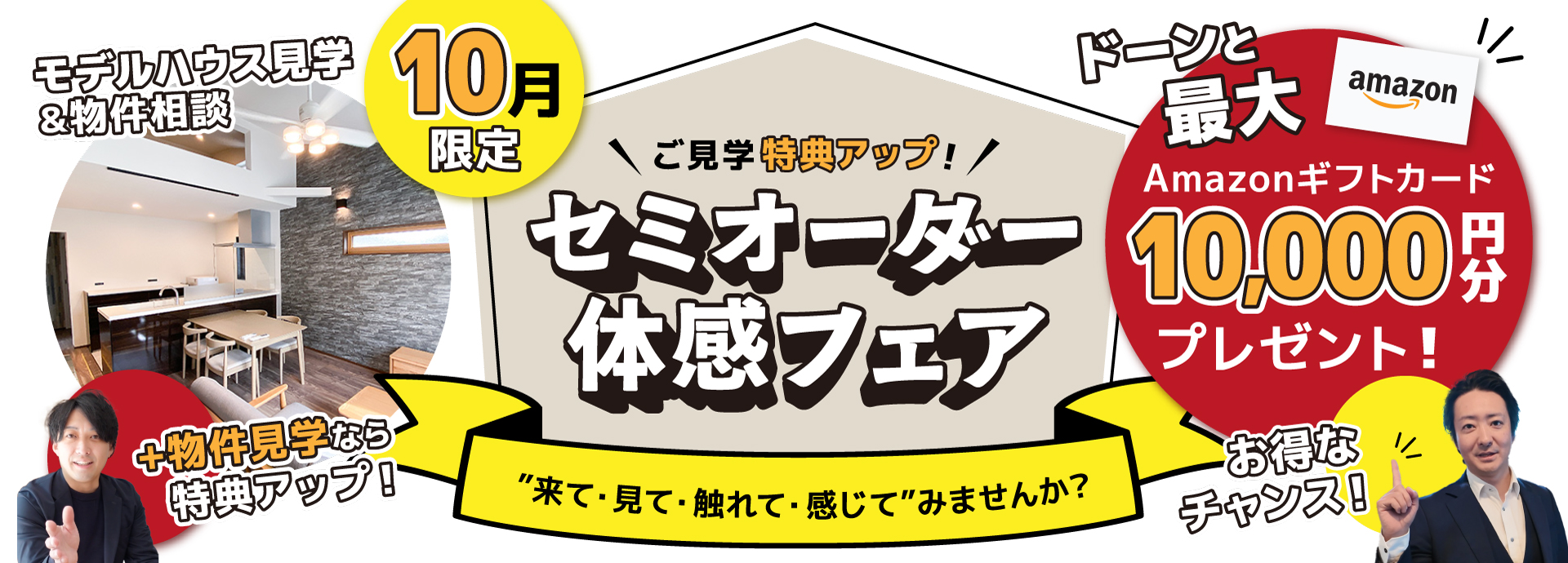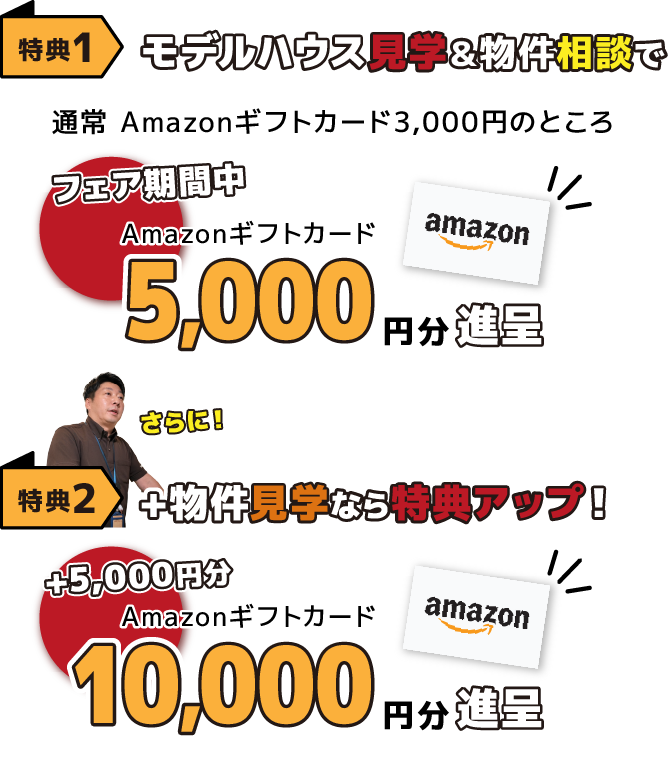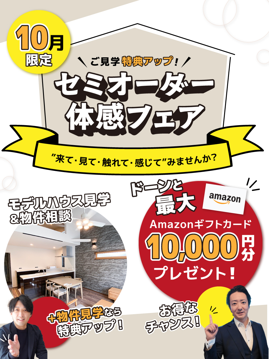 【セミオーダー体感フェア】のキャンペーン期間中、 モデルハウス見学+物件相談などのほか 進呈条件を満たしていただいたお客様に、 Amazonギフト券 ドーンと最大 10,000円分!を進呈いたします。